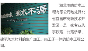 湖北雨睛防水工程有限公司地處湖北宜昌高新技術(shù)公司獲得了國家質(zhì)量管理體系認證證書,也取得了湖北省建筑防水材料專業(yè)協(xié)會會員資格;并榮獲了湖北省建設(shè)廳頒發(fā)的建筑施工貳......[更多]